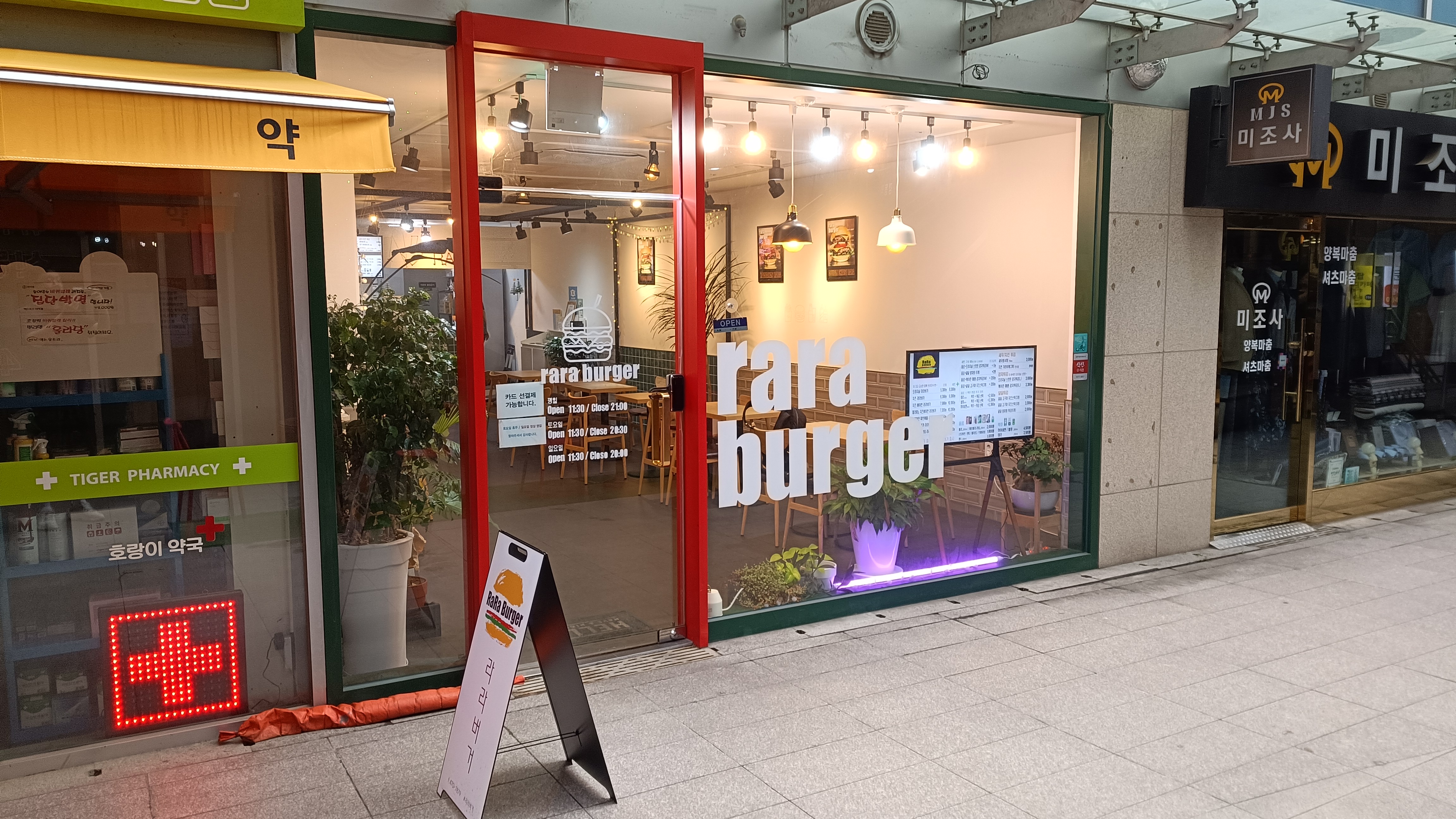 강동역과 연결된 스트리트 상가에 위치한 라라버거.