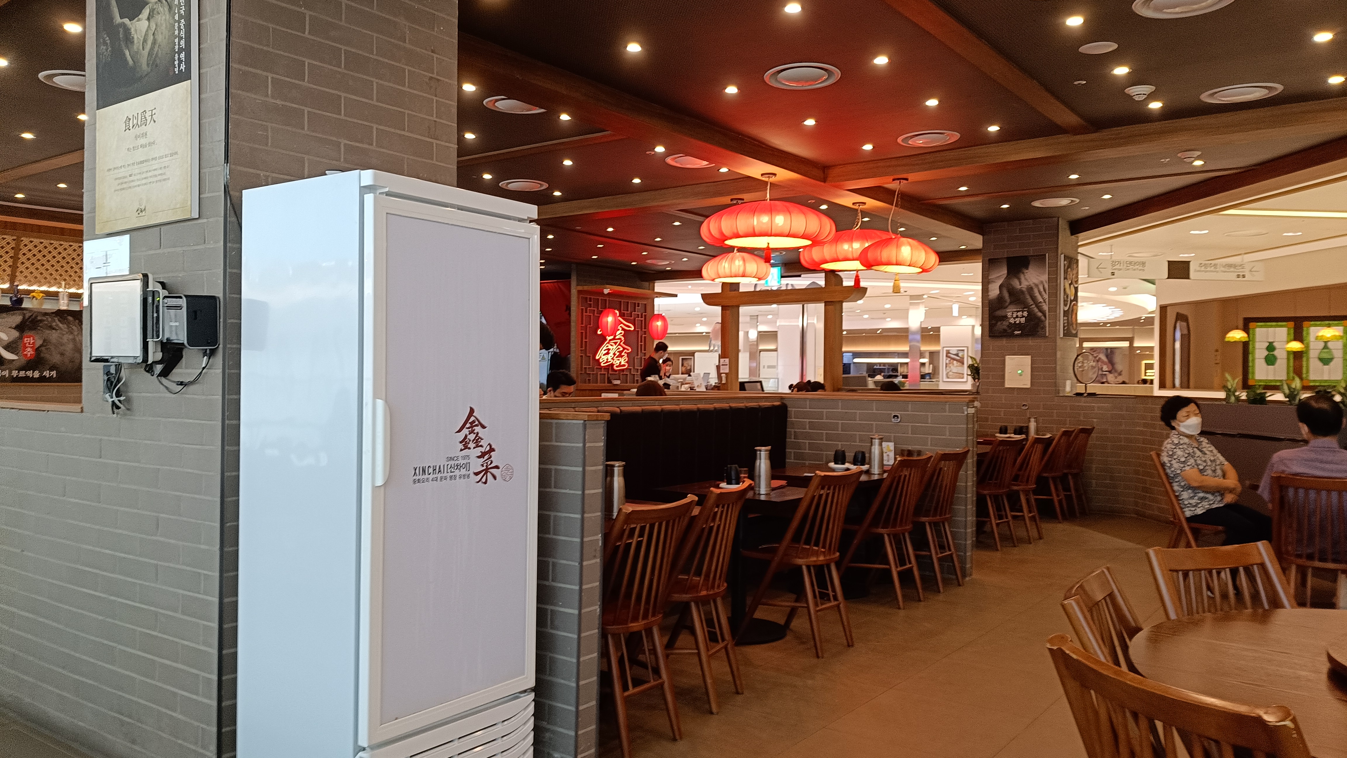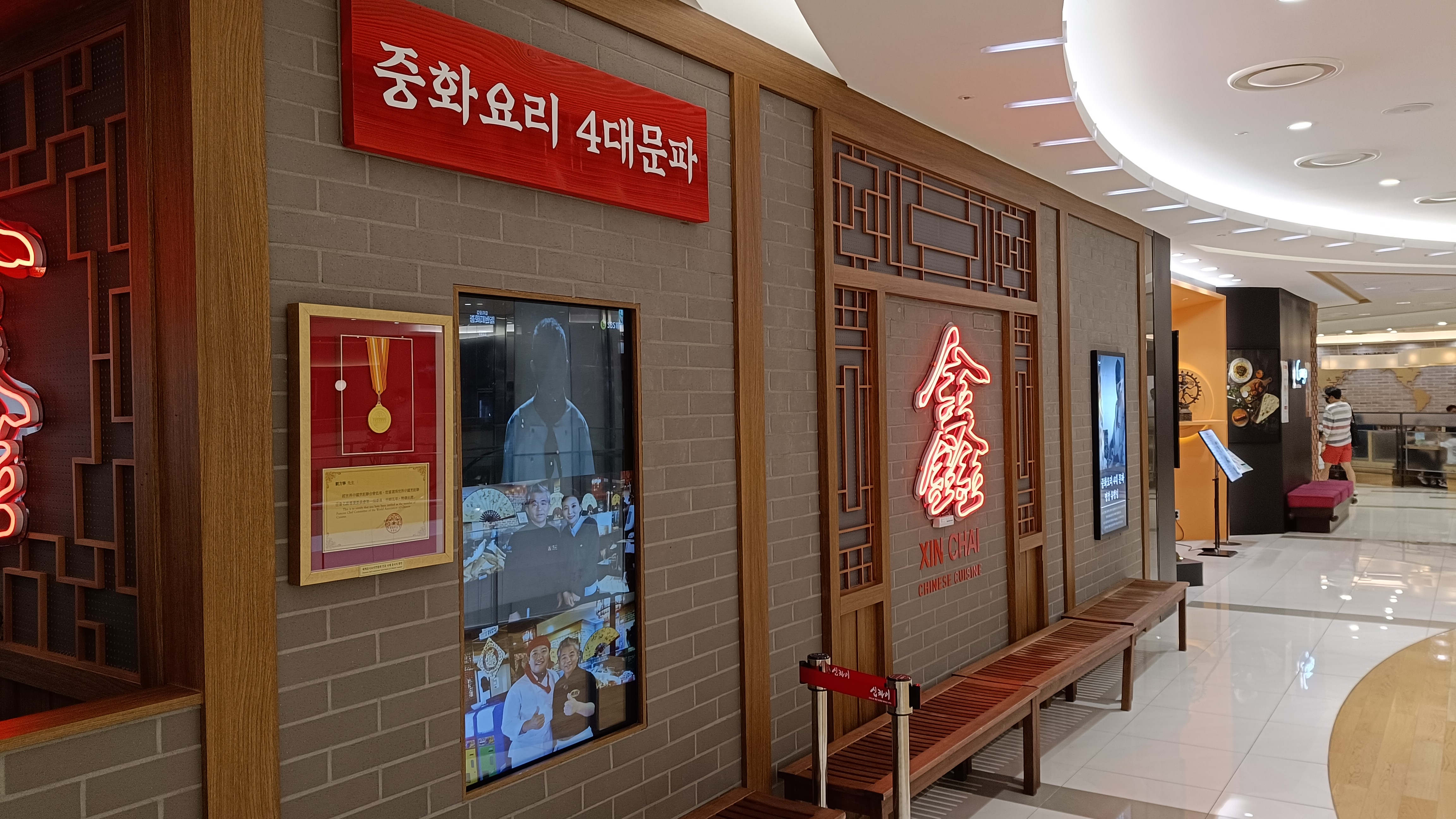 영등포 타임스퀘어 4층 식당가에 위치한 신차이. 중화요리 4대문파라는 간판이 걸려 있다.