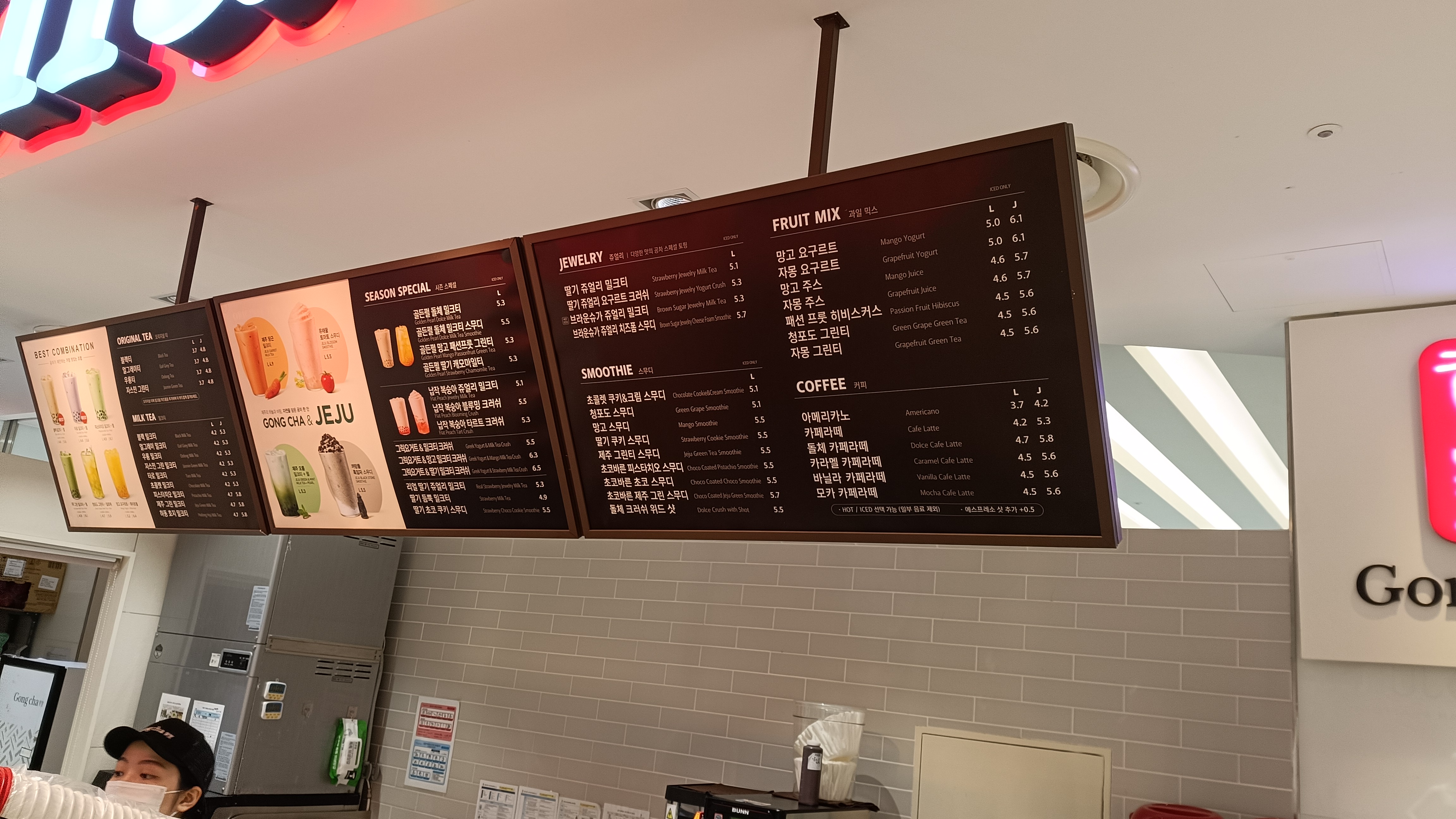 망고주스 라지 4,600원, 블랙밀크티 라지 4,200원을 주문. 이제는 공차도 가성비에서 밀리는 수준이다.