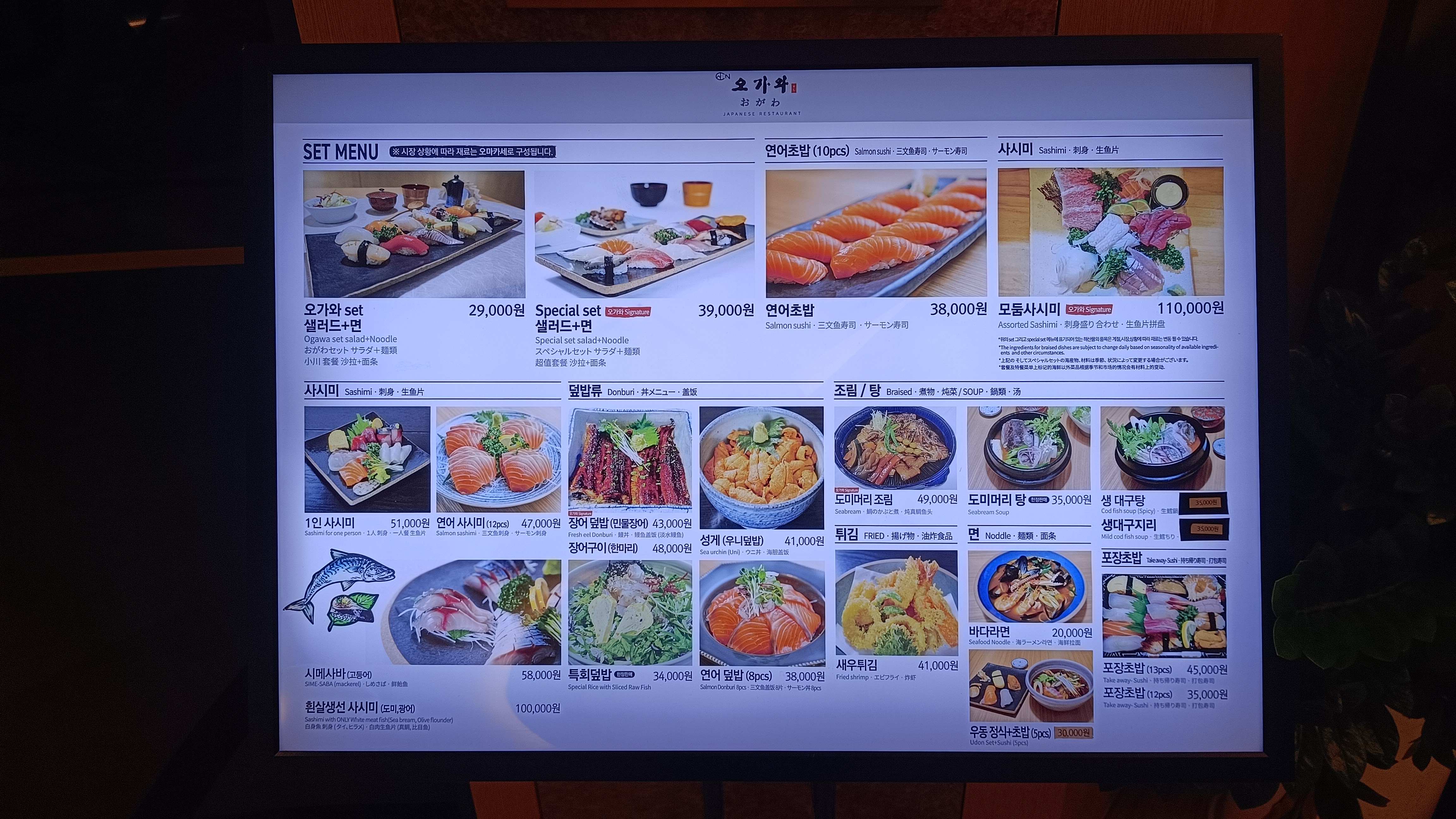제일 싼 메뉴가 바다라면으로 20,000원, 오가와세트 29,000원, 대구지리도 가볍게 35,000원이다.