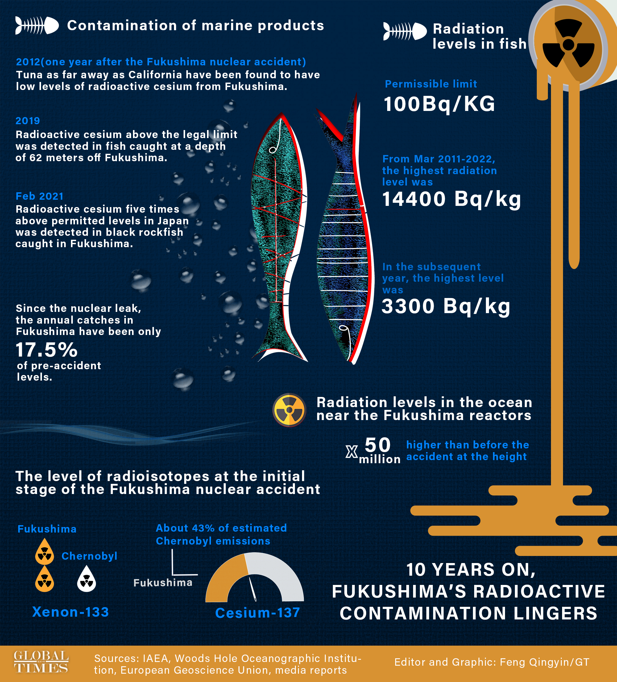 일본 정부 스스로 발표하고 있는 (가공된 흔적이 너무 많아 질타를 받고 있는) 자료에만 국한해도 2021년 후쿠시마 근해에서 잡힌 생선에서 기준치의 5배가 넘는 세슘이 발견되었다. 또한 후쿠시마 근해의 방사능 농도는 사고 이전의 무려 5천만배에 달한다.