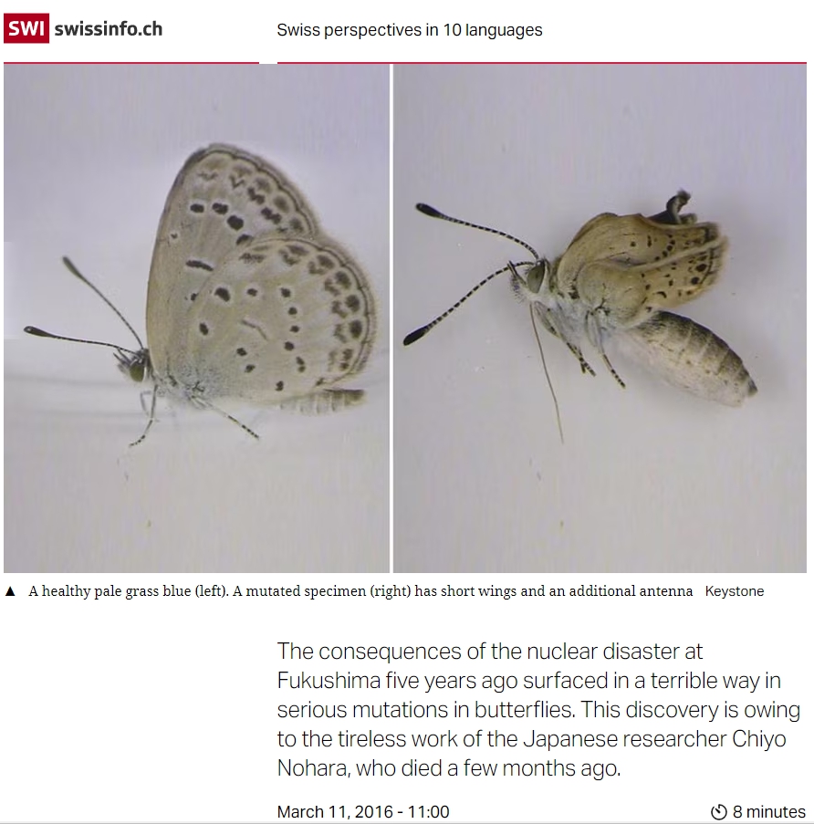 생태계에의 영향은 당연히 심각하겠지만 역시 정부의 방해와 차단으로 제대로 된 연구는 이루어지지 못했다. 게다가 일본도 한국만큼은 아니지만 어용 학자들이 많다. 그러나 역시 몇몇 뜻 있는 학자들은 위험과 공권력을 등에 업은 자들의 비판에도 불구하고 연구를 지속하고 있다. 2016년 치요 노하라 박사가 사망하면서 나비에 대한 연구결과는 그 이후 자료를 찾을 수 없었지만, 당시까지의 연구만으로도 많은 수의 기형 나비들이 발견되었다. 심각했던 것은 기형 나비의 개체수도 증가했지만 그 기형의 강도였다.