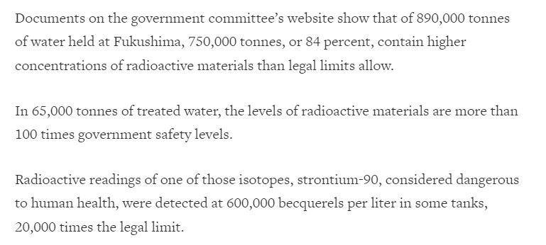 당시 로이터가 이에 대해 제대로 보도했었는데, 탱크에 저장되어 있던 처리수 중 84%가 법적 허용치 이상의 방사능 물질을 함유하고 있었고, 이는 기준치의 100배 이상에 달했으며, 인체에 해로운 스트론튬-90의 경우는 무려 기준치의 2만배였다. 이 물이 본격적으로 쏟아져 나오는거다. (지금까지 봉인에 실패해 땅과 지하와 공기로 흘러들어간 오염물질도 매우 많지만)