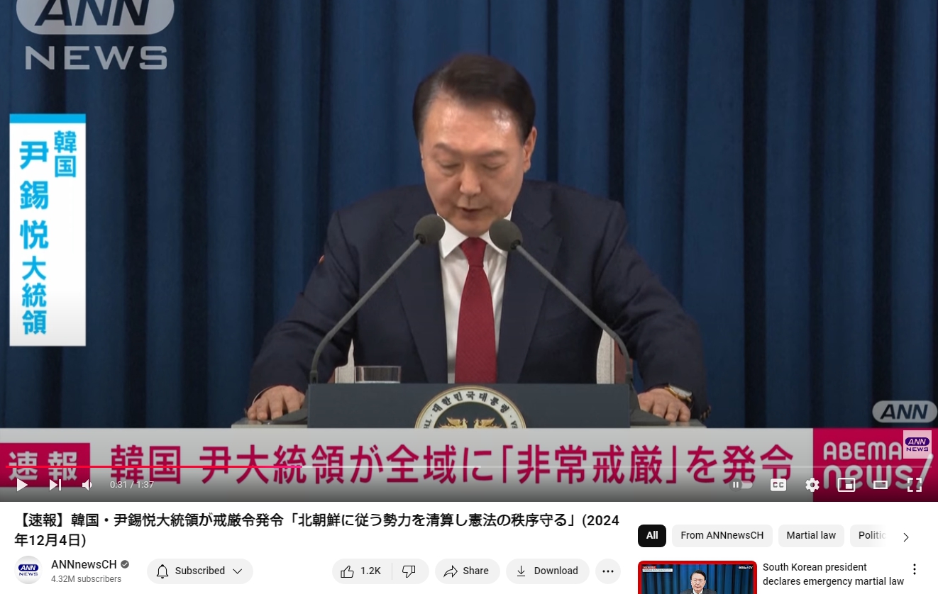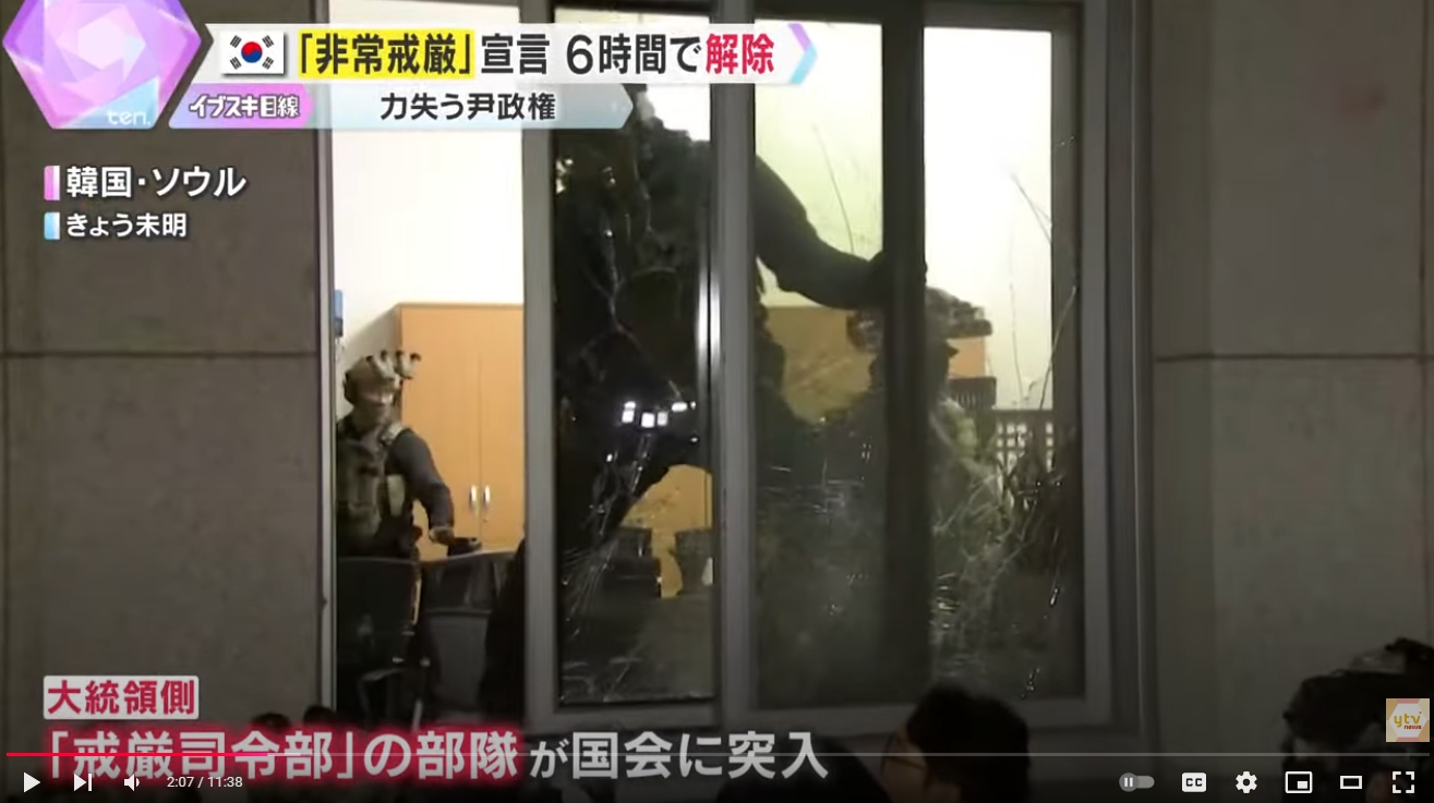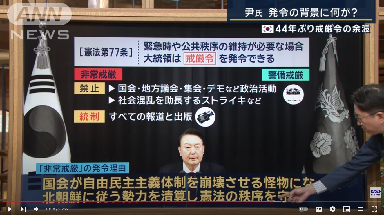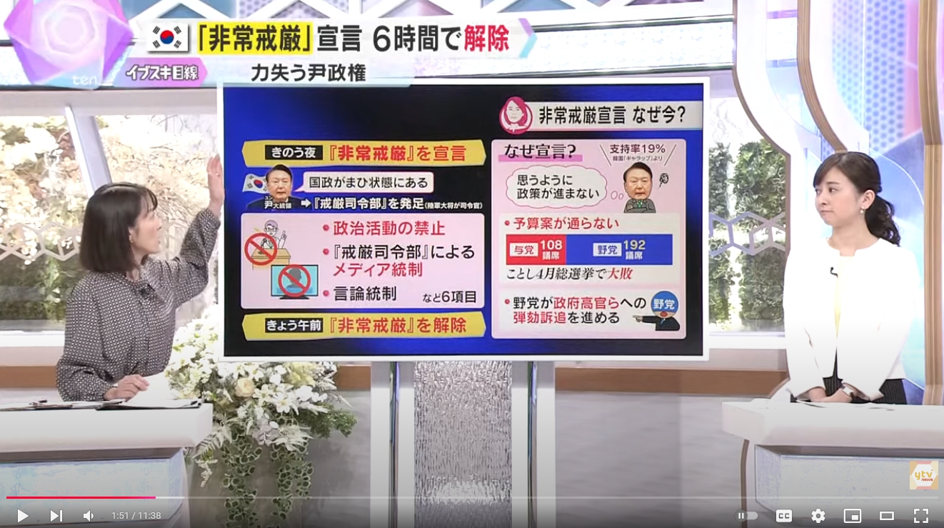 한국의 계엄령이라는 것에 대해 일본은 매우 희안하게 생각하는 분위기인데, 우선 비상계엄을 선언하면 국정이 마비상태가 되고, 정치활동 금지, 계엄사령부에 의한 매체 통제, 언론 통제 등 6개 항목이 진행된다고 소개했다. 도대체 왜 이렇게까지 강력한 권한을 주고 왜 대통령은 이런 극심한 혼란을 야기하는지에 대해 놀라던 진행자는, 그 이유에 대해서는 생각보다 정책이 진전되지 않아서인듯 하다고 언급하며, 지지율 19%, 의석수 여당 108 : 야당 192인 상황, 야딩이 정부고관에 대한 탄핵소추를 진행하는 등의 상황에 의한 것이라고 짚었다.