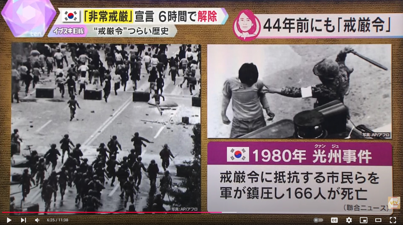 이번 윤의 계엄령이 한국에서 44년만에 처음이라며, 1980년 전두환에 의한 쿠테타 당시 계엄령에 저항한 시민들을 군이 진압하여 공식적으로만 해도 166명이 사망했다고 비교적 자세히 다루었다.
