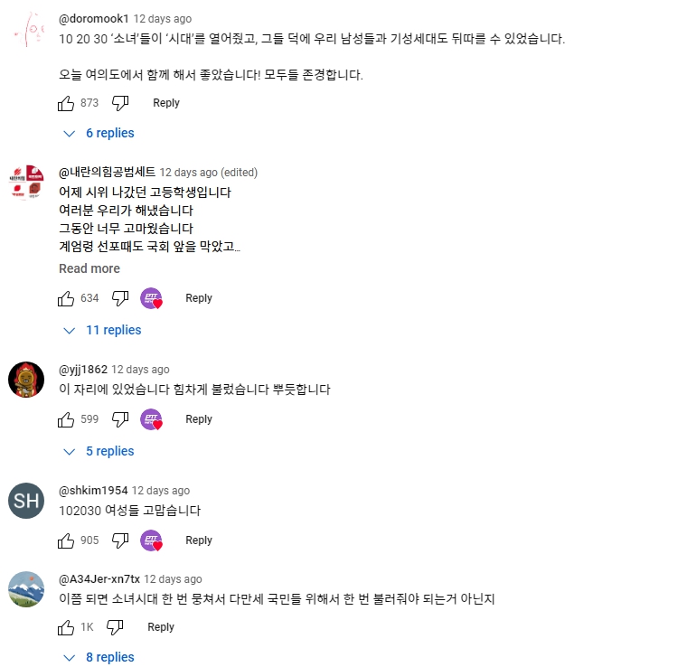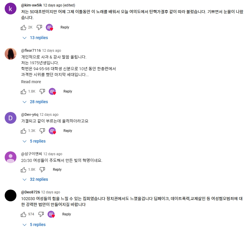 다만, 87년 서울의 봄을 통해 대한민국에서 드디어 대통령 직선제를 이끌어낸 오대남들이 조선애국보수들에게 빨갱이 종북 학생운동세력으로 취급되어 왔던 것처럼, 사회의 진보를 지향하는 젊은 여성들이 개딸, 페미, 각종 욕설도배로 취급될 것임이 분명하기에, 한편으론 안스러운 생각도 든다. 그래도 대한민국에 희망을 보여준 그대들에게 나 또한 아래 영상의 댓글들처럼 감사의 인사를 전하고 싶다.