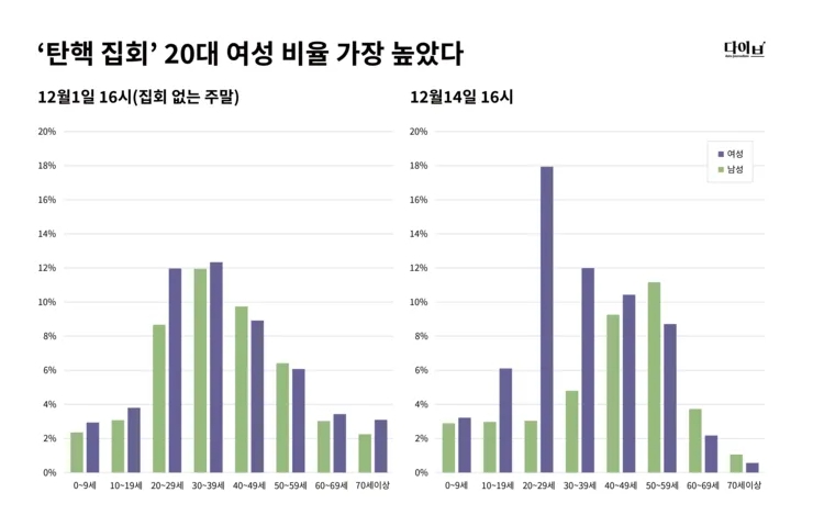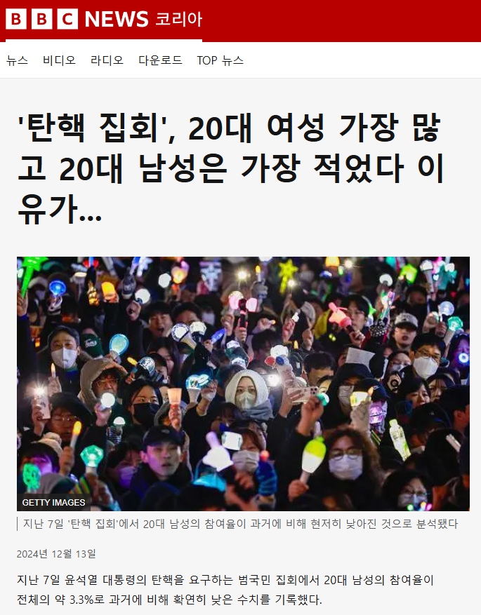 민족정론지답게 정확한 숫자를 조사해서 공개한다. 통계에 따라, 날짜에 따라 조금씩 다르지만 탄핵 가결 당일 기준 18% 또는 1/3이 2030 여성이었다는 조사 결과다. 87년 서울의 봄을 이끌고 경험했던 50대 남성들이 젊은 여성들 다음으로 많았고, 광장에서 젊은 여성들을 본 이들은 MZ가 민주의 약자였다며 감동했다. 반면 이대남은 3%에 불과했다.