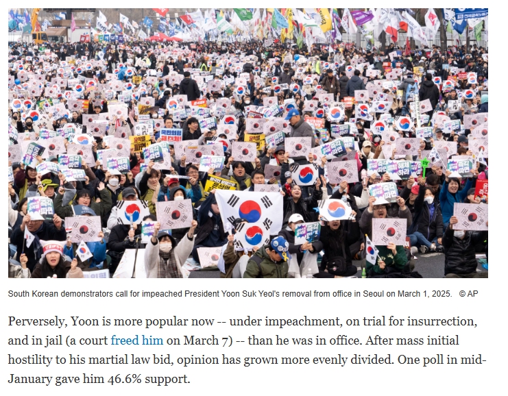 아이러니하게도, 탄핵을 당하고 반란 혐의로 재판을 받고 있으며, 심지어 감옥에 수감되었다가(법원은 3월 7일 그를 석방했다)도, 윤 대통령은 재임 시절보다 더 많은 지지를 받고 있다. 계엄령 시도에 대한 대중의 강한 반발 이후, 여론은 점점 균형을 이루는 모습이다. 1월 중순 한 여론조사에서는 그의 지지율이 46.6%에 달했다.