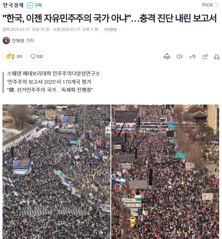 세계적으로 많이 이용되는 스웨덴 예테보리대학에서 매년 발표하는 민주주의보고서가 발간되었다. 조선에서 빨갱이 대마왕으로 취급받는 문재인 시절 역사상 최초로 자유민주주의 등급에 올라갔던 대한민국 민주주의는 단 2년만에 선거 민주주의 등급으로 하향 조정되었고, 심지어 독재화가 진행중이라는 진단을 받았다. 보고서 전문은 아래 링크에서 무료로 다운받을 수 있다.